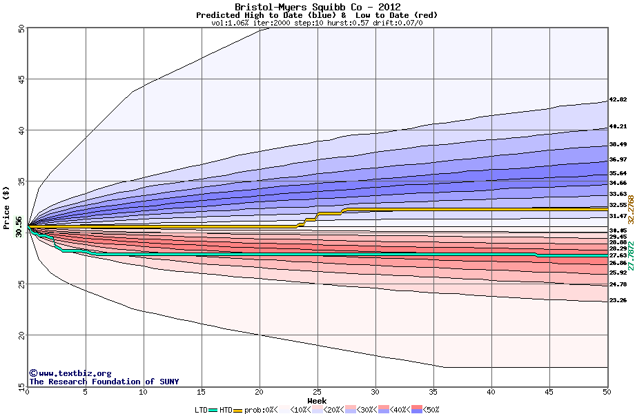 The high to date and low to date prices of the stock plotted against a random walk model for 2012 (what's this?).
