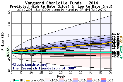 The high to date and low to date prices of the stock plotted against a random walk model for 2014 (what's this?).