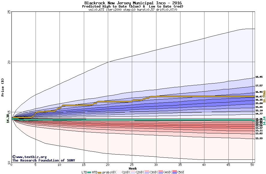 The high to date and low to date prices of the stock plotted against a random walk model for 2016 (what's this?).