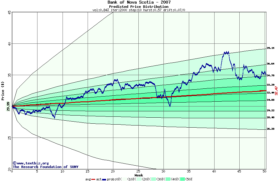 The following graph plots the year-to-date performance of the stock for 2007 compared to the probability calculated by a random walk model.