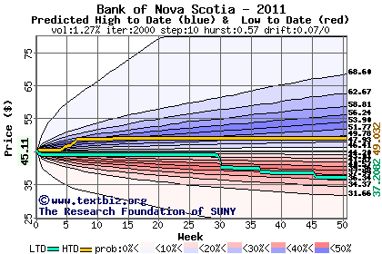 The high to date and low to date prices of the stock plotted against a random walk model for 2011 (what's this?).