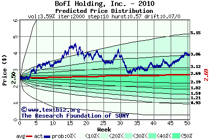 The high to date and low to date prices of the stock plotted against a random walk model for 2010 (what's this?).