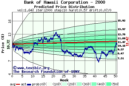 The high to date and low to date prices of the stock plotted against a random walk model for 2000 (what's this?).