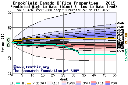 The high to date and low to date prices of the stock plotted against a random walk model for 2015 (what's this?).