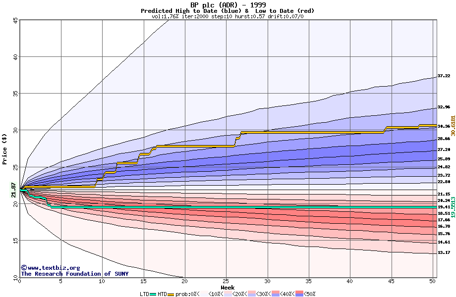 The high to date and low to date prices of the stock plotted against a random walk model for 1999 (what's this?).