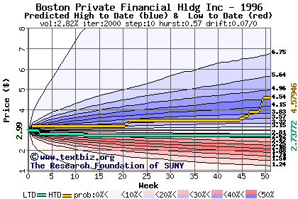 The high to date and low to date prices of the stock plotted against a random walk model for 1996 (what's this?).