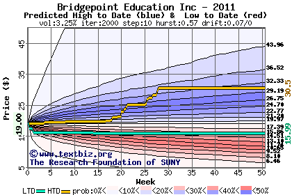 The high to date and low to date prices of the stock plotted against a random walk model for 2011 (what's this?).
