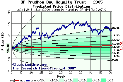 The following graph plots the year-to-date performance of the stock for 2005 compared to the probability calculated by a random walk model.