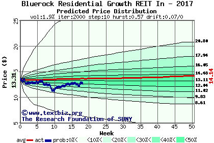 The high to date and low to date prices of the stock plotted against a random walk model for 2017 (what's this?).
