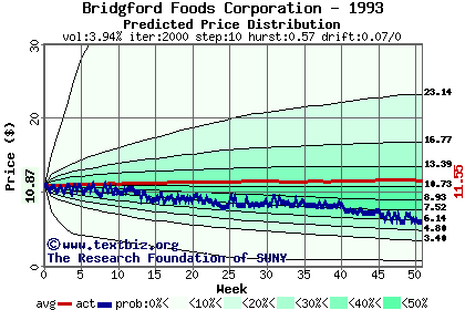 The high to date and low to date prices of the stock plotted against a random walk model for 1993 (what's this?).
