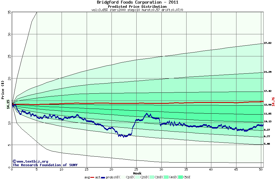 The high to date and low to date prices of the stock plotted against a random walk model for 2011 (what's this?).