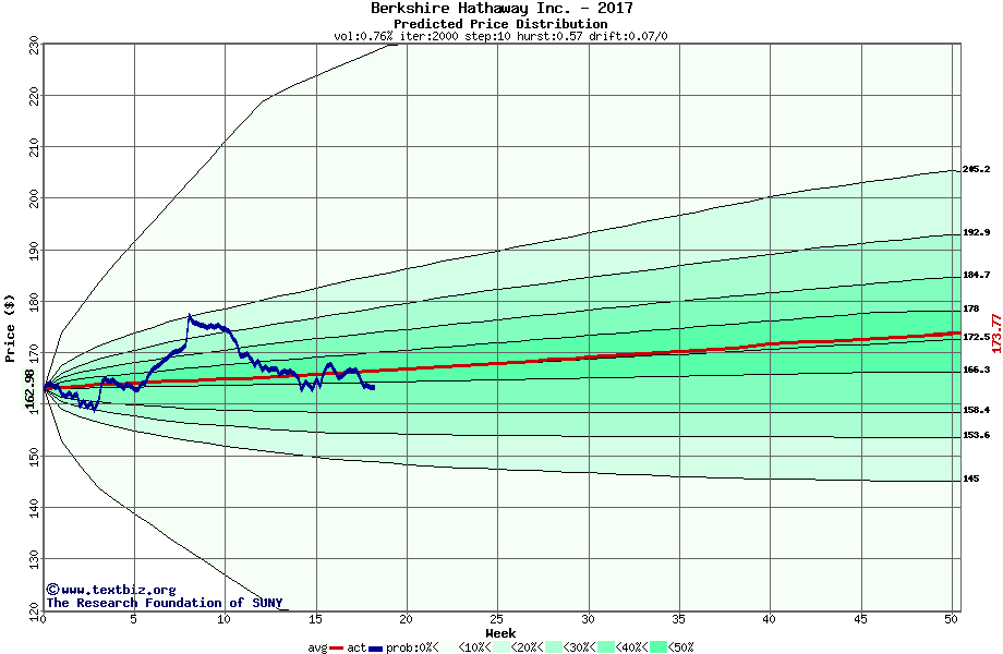 The following graph plots the year-to-date performance of the stock for 2017 compared to the probability calculated by a random walk model.