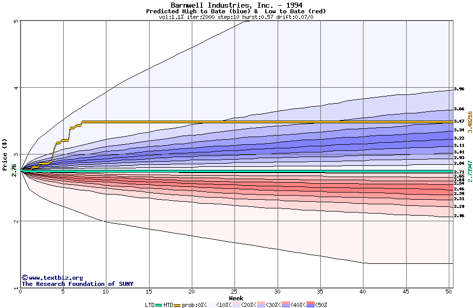 The high to date and low to date prices of the stock plotted against a random walk model for 1994 (what's this?).