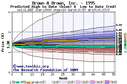 The high to date and low to date prices of the stock plotted against a random walk model for 1995 (what's this?).