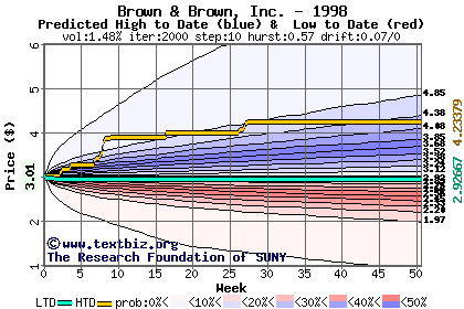 The high to date and low to date prices of the stock plotted against a random walk model for 1998 (what's this?).