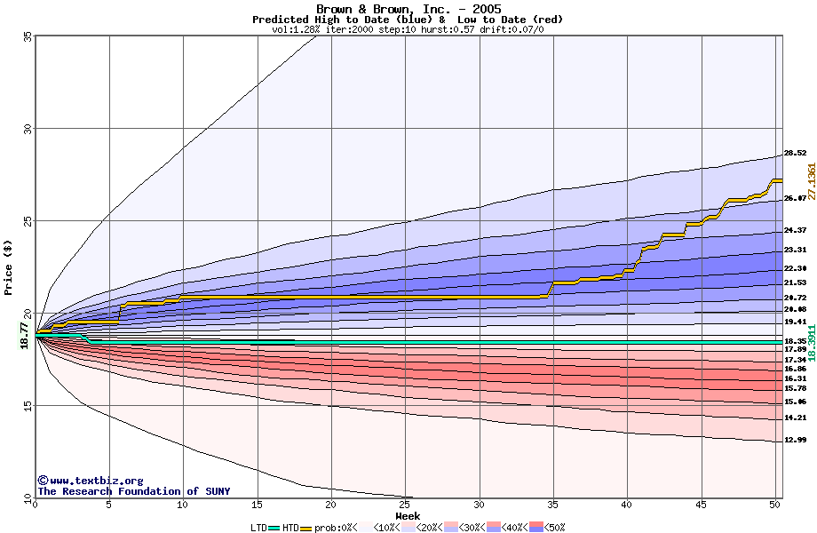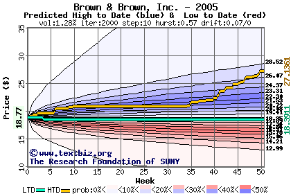 The high to date and low to date prices of the stock plotted against a random walk model for 2005 (what's this?).