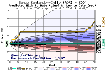 The high to date and low to date prices of the stock plotted against a random walk model for 2004 (what's this?).