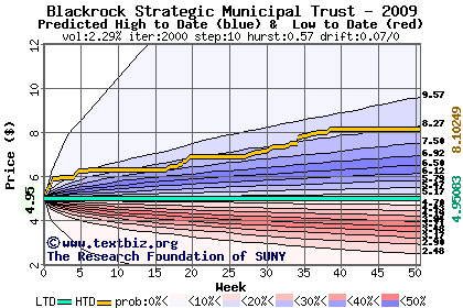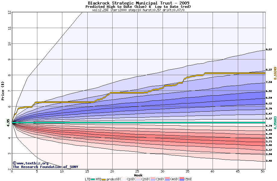 The high to date and low to date prices of the stock plotted against a random walk model for 2009 (what's this?).