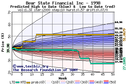 The high to date and low to date prices of the stock plotted against a random walk model for 1998 (what's this?).