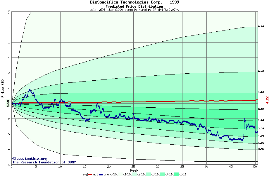The following graph plots the year-to-date performance of the stock for 1999 compared to the probability calculated by a random walk model.