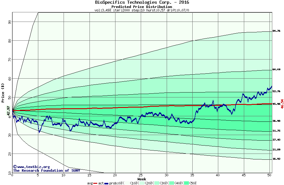 The following graph plots the year-to-date performance of the stock for 2016 compared to the probability calculated by a random walk model.
