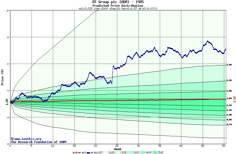 The following graph plots the year-to-date performance of the stock for 1985 compared to the probability calculated by a random walk model.