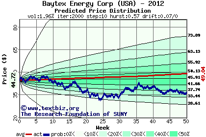 The high to date and low to date prices of the stock plotted against a random walk model for 2012 (what's this?).