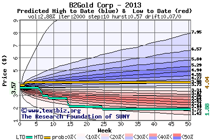 The high to date and low to date prices of the stock plotted against a random walk model for 2013 (what's this?).