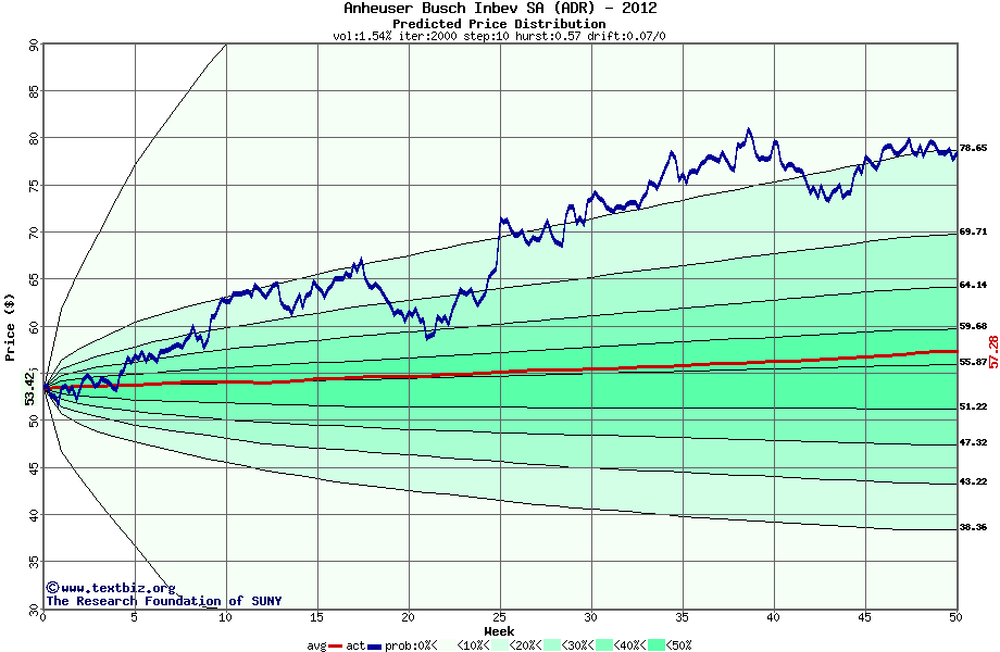 The following graph plots the year-to-date performance of the stock for 2012 compared to the probability calculated by a random walk model.