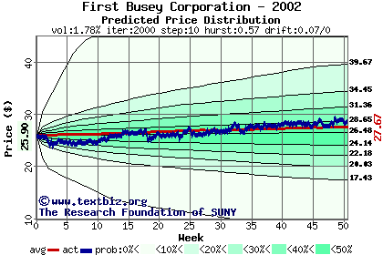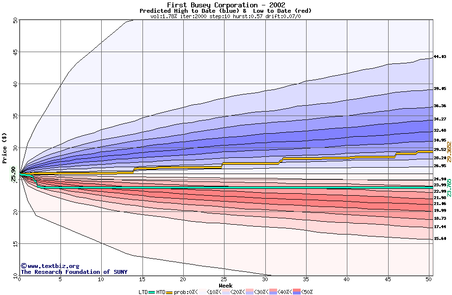 The high to date and low to date prices of the stock plotted against a random walk model for 2002 (what's this?).