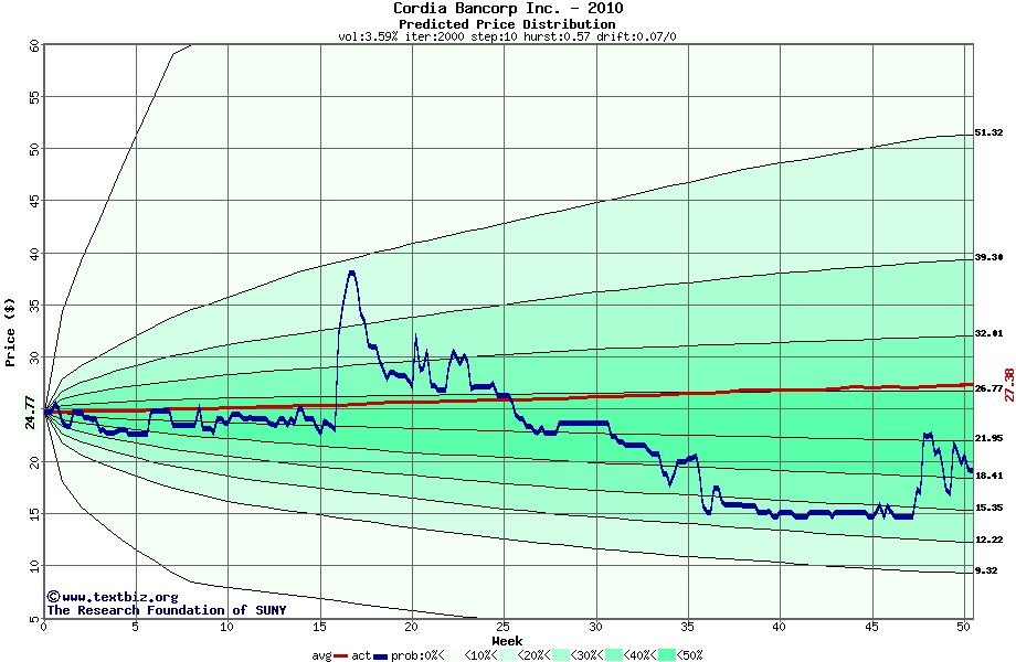 The high to date and low to date prices of the stock plotted against a random walk model for 2010 (what's this?).