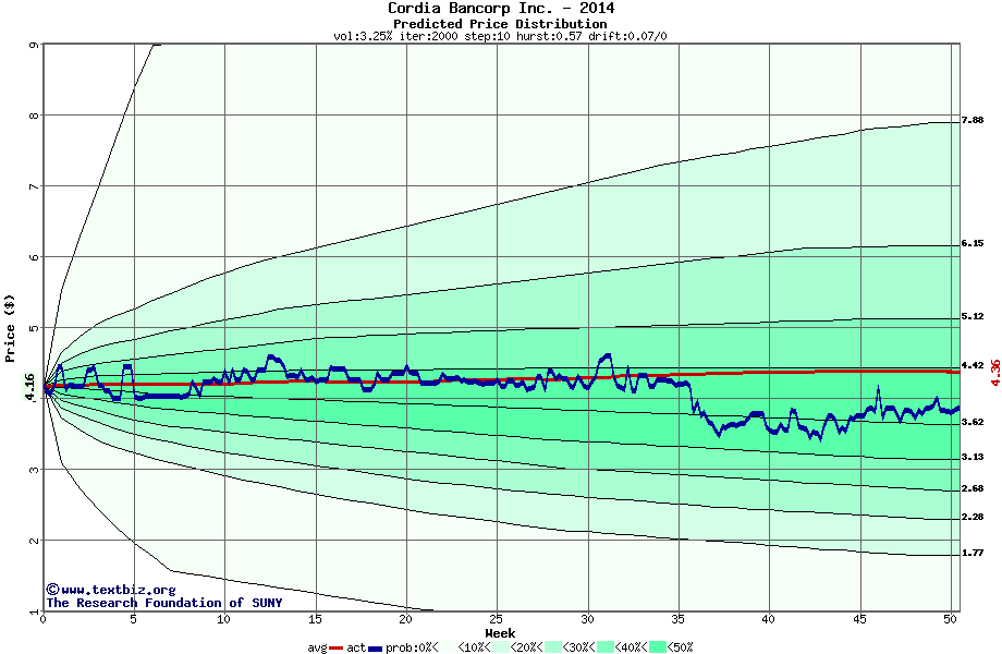 The high to date and low to date prices of the stock plotted against a random walk model for 2014 (what's this?).