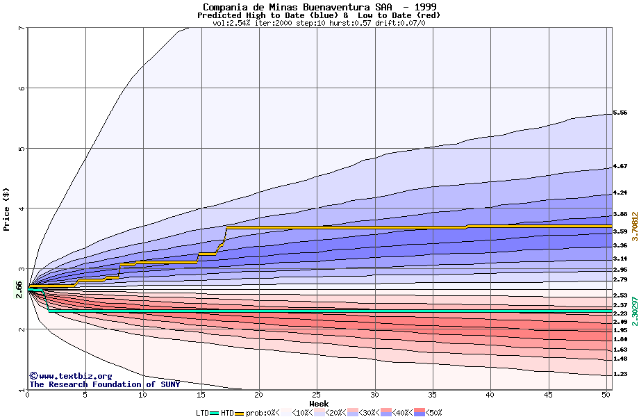 The high to date and low to date prices of the stock plotted against a random walk model for 1999 (what's this?).