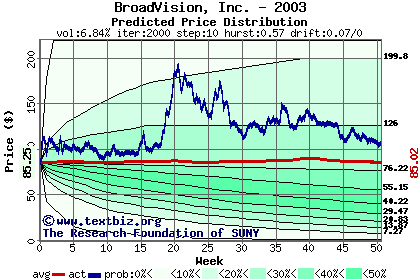 The high to date and low to date prices of the stock plotted against a random walk model for 2003 (what's this?).