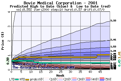 The high to date and low to date prices of the stock plotted against a random walk model for 2001 (what's this?).