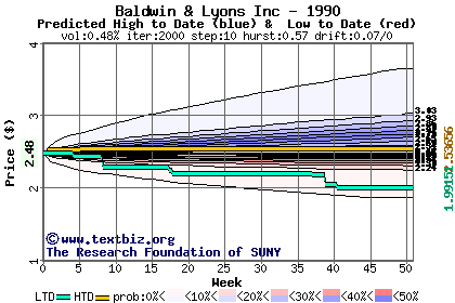 The high to date and low to date prices of the stock plotted against a random walk model for 1990 (what's this?).
