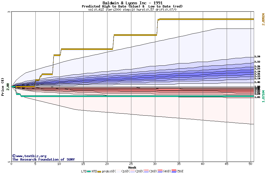 The high to date and low to date prices of the stock plotted against a random walk model for 1991 (what's this?).