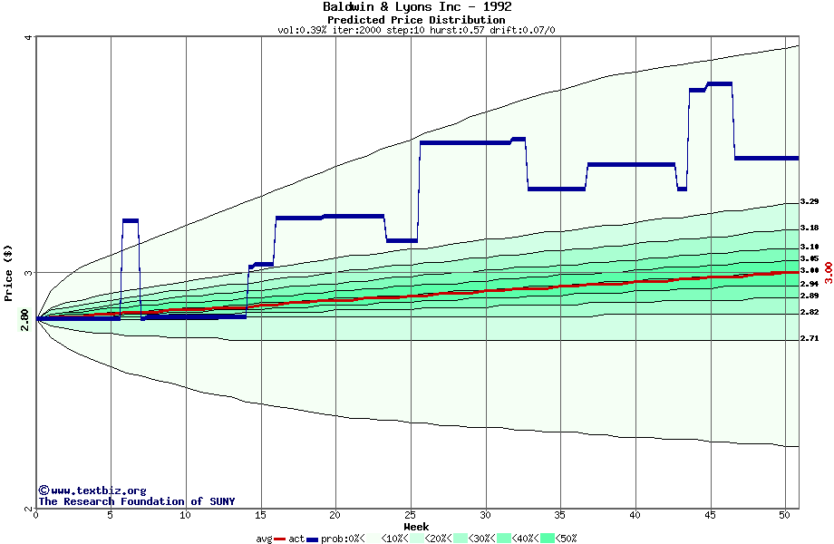 The following graph plots the year-to-date performance of the stock for 1992 compared to the probability calculated by a random walk model.