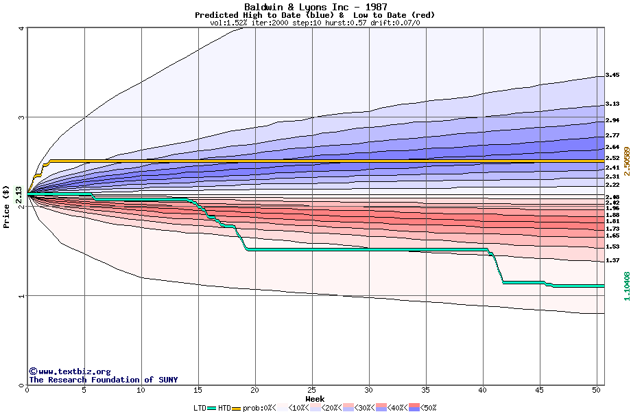 The high to date and low to date prices of the stock plotted against a random walk model for 1987 (what's this?).