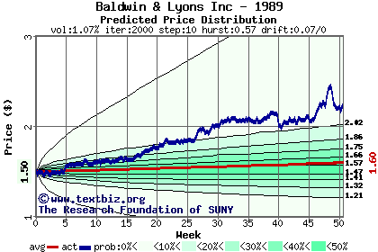 The high to date and low to date prices of the stock plotted against a random walk model for 1989 (what's this?).