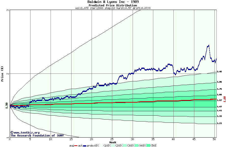 The following graph plots the year-to-date performance of the stock for 1989 compared to the probability calculated by a random walk model.