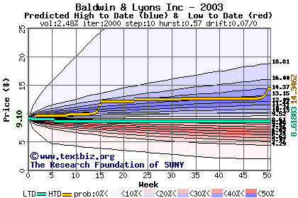 The high to date and low to date prices of the stock plotted against a random walk model for 2003 (what's this?).