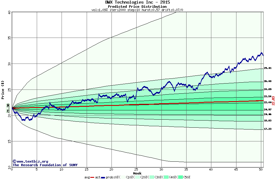 The following graph plots the year-to-date performance of the stock for 2015 compared to the probability calculated by a random walk model.