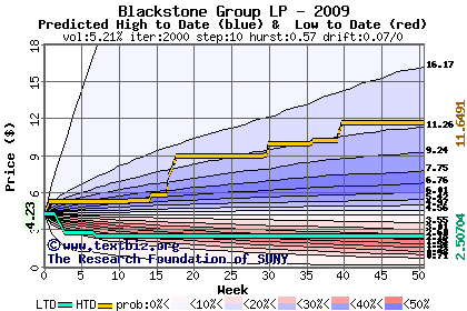 The high to date and low to date prices of the stock plotted against a random walk model for 2009 (what's this?).
