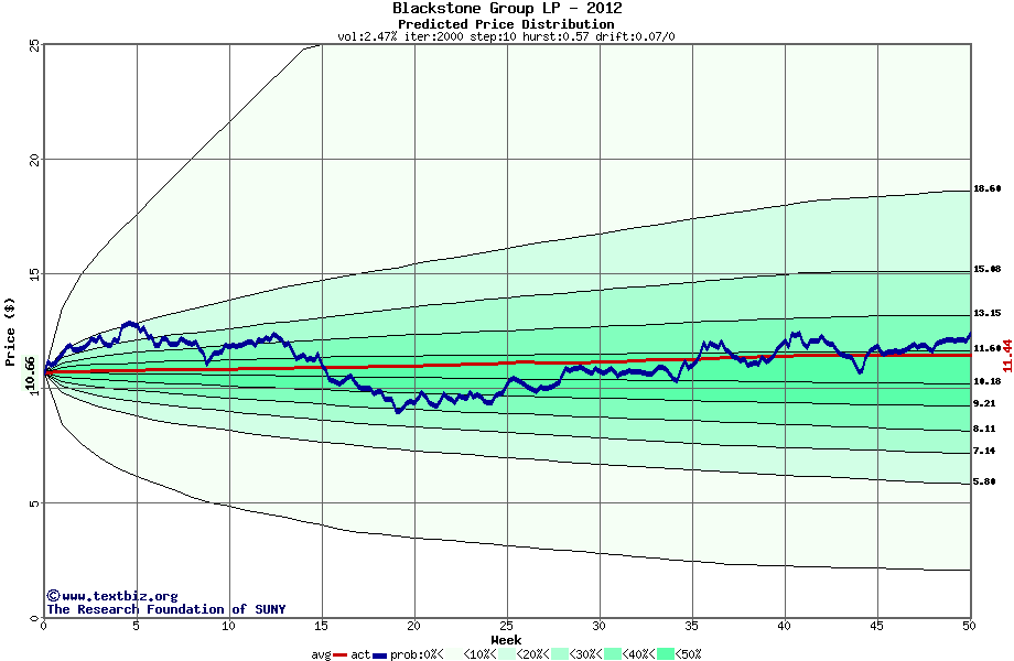 The following graph plots the year-to-date performance of the stock for 2012 compared to the probability calculated by a random walk model.
