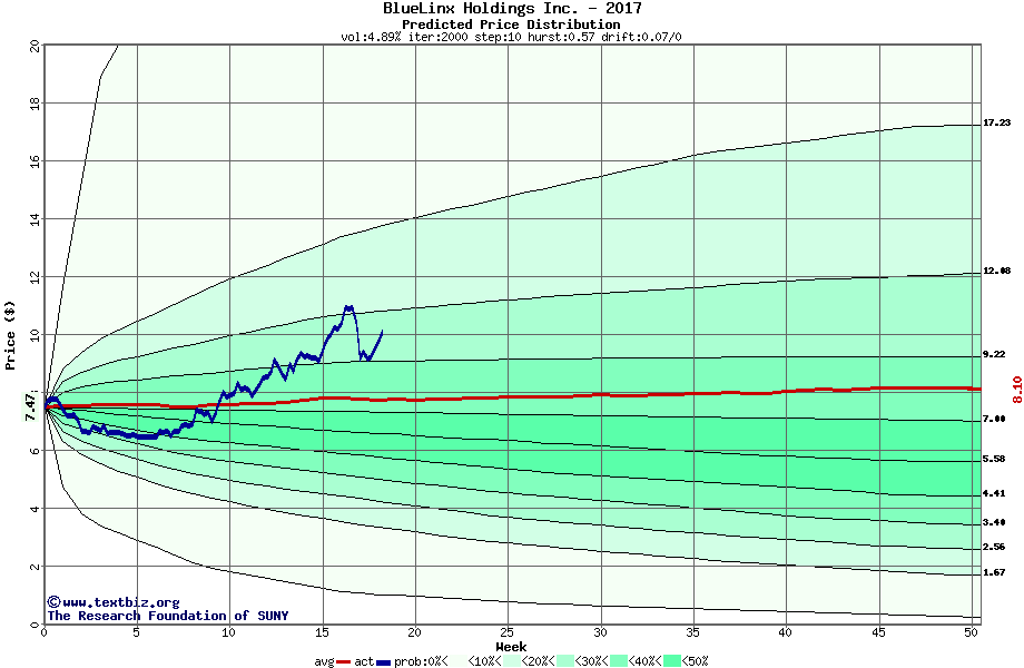 The following graph plots the year-to-date performance of the stock for 2017 compared to the probability calculated by a random walk model.