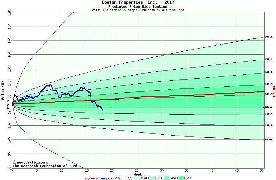 The following graph plots the year-to-date performance of the stock for 2017 compared to the probability calculated by a random walk model.