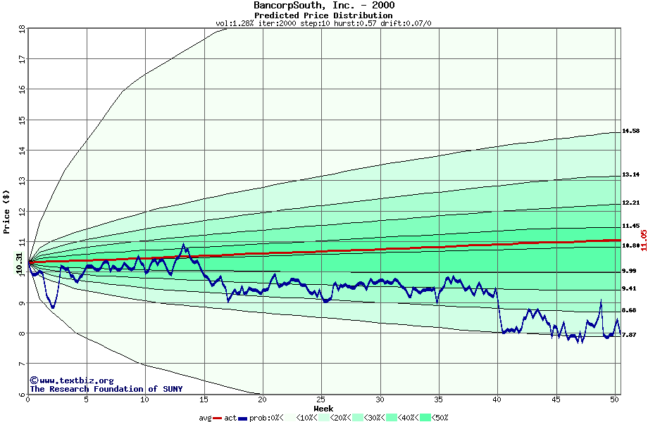The following graph plots the year-to-date performance of the stock for 2000 compared to the probability calculated by a random walk model.