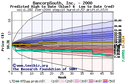The high to date and low to date prices of the stock plotted against a random walk model for 2000 (what's this?).