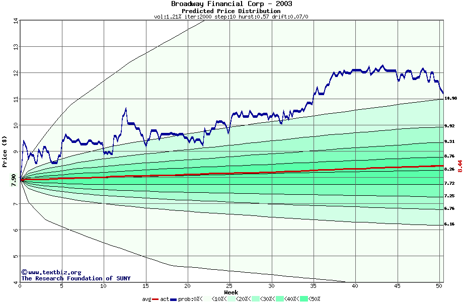 The following graph plots the year-to-date performance of the stock for 2003 compared to the probability calculated by a random walk model.